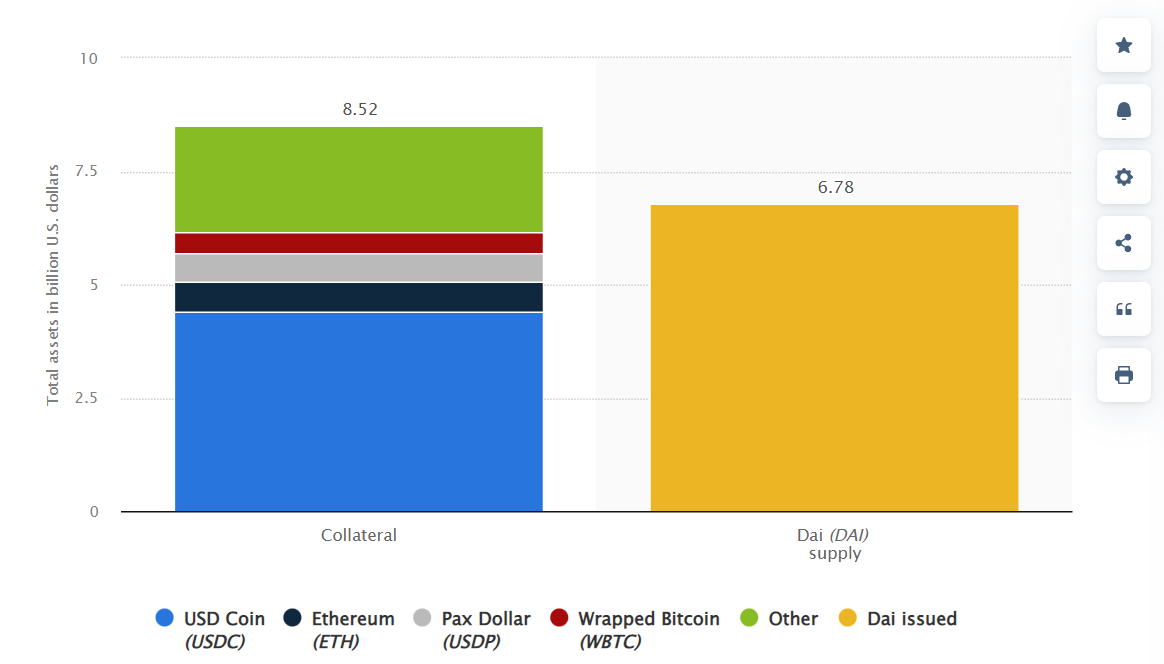 A razão para essa alocação é que tanto o Ethereum quanto o Bitcoin são criptomoedas com as maiores capitalizações de mercado. Portanto, eles são menos propensos a oscilações bruscas de preços que podem afetar a indexação de um para um do DAI ao dólar. Por outro lado, a USD Coin é a stablecoin centralizada mais usada porque é 100% lastreada por reservas em dólar, ou equivalentes.