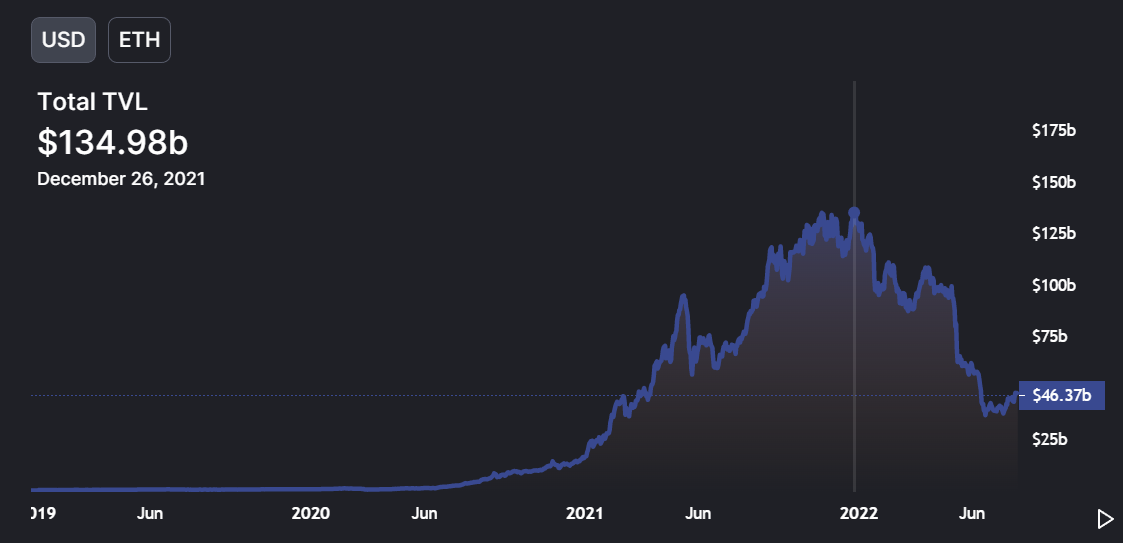Durante 2020 e 2021, a popularidade dos dApps explodiu. A certa altura, em dezembro de 2021, o TVL da Ethereum atingiu quase US$ 135 bilhões antes de voltar cair.