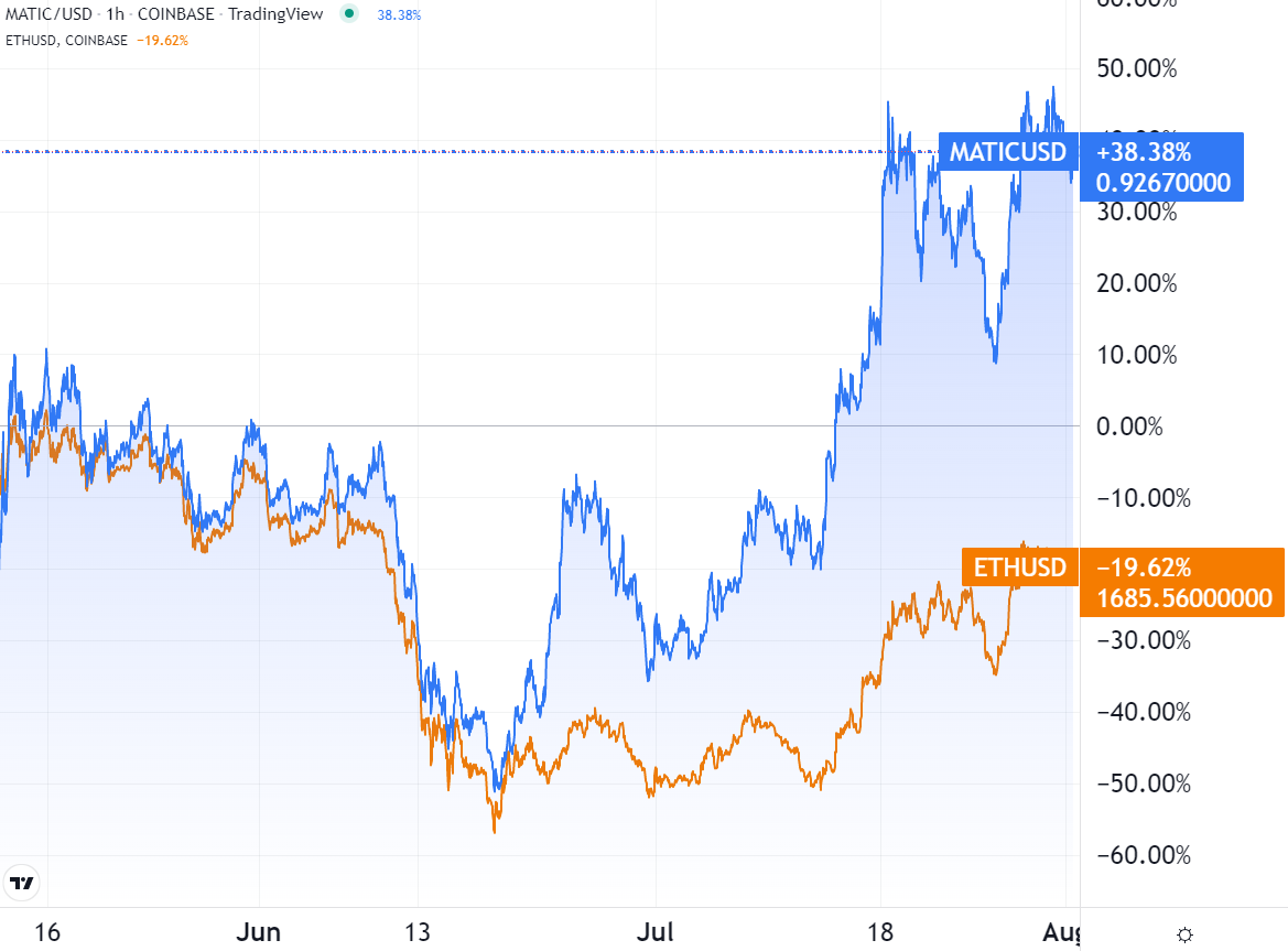 De maio a agosto de 2022, MATIC superou a ETH em quase +60%. No entanto, devido ao mercado de baixa causado pelos aumentos das taxas de juros do Federal Reserve, MATIC caiu 69% em relação à sua alta histórica de US$ 2,92 em dezembro de 2021.