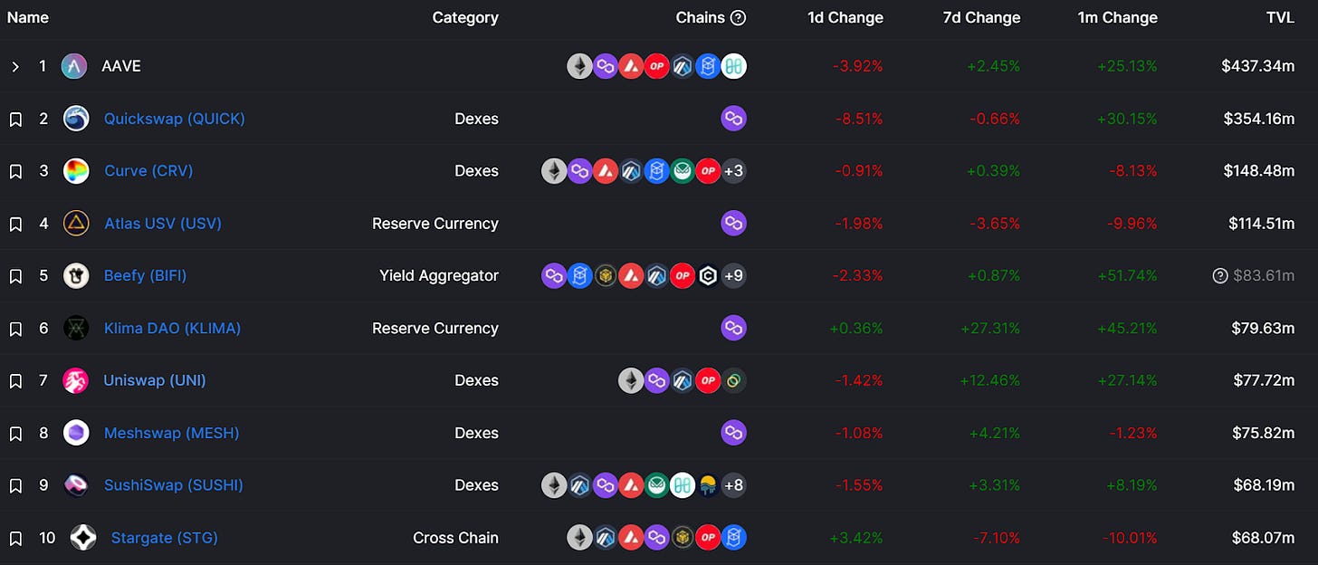 Polygon é dominado por dApps que oferecem serviços de empréstimo. Entre os principais está o Aave, com 21,4% de participação, importado da Ethereum. Outros dApps mais populares também são relacionado às finanças descentralizadas (DeFi).