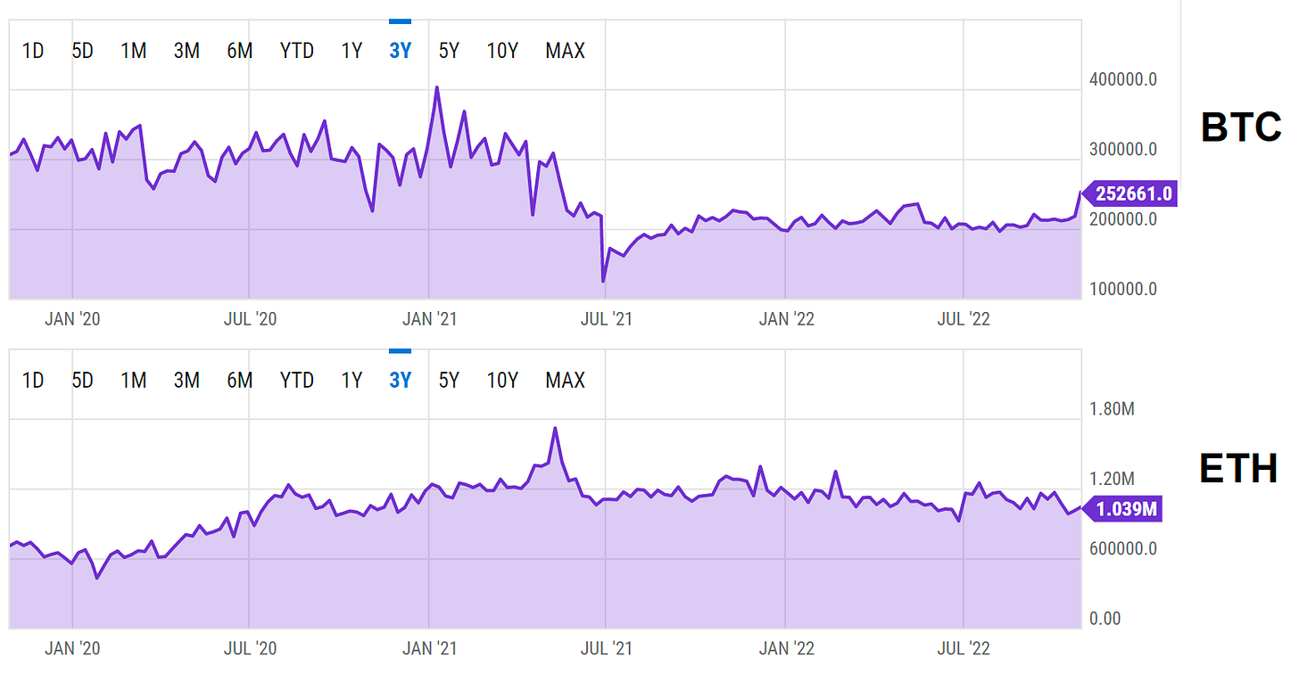 A razão para esta discrepância: o Bitcoin foi projetado para funcionar como dinheiro digital entre pessoas (p2p sound money). Por outro lado, a Ethereum é uma rede flexível de contratos inteligentes, hospedando centenas de aplicações descentralizadas (dApps).